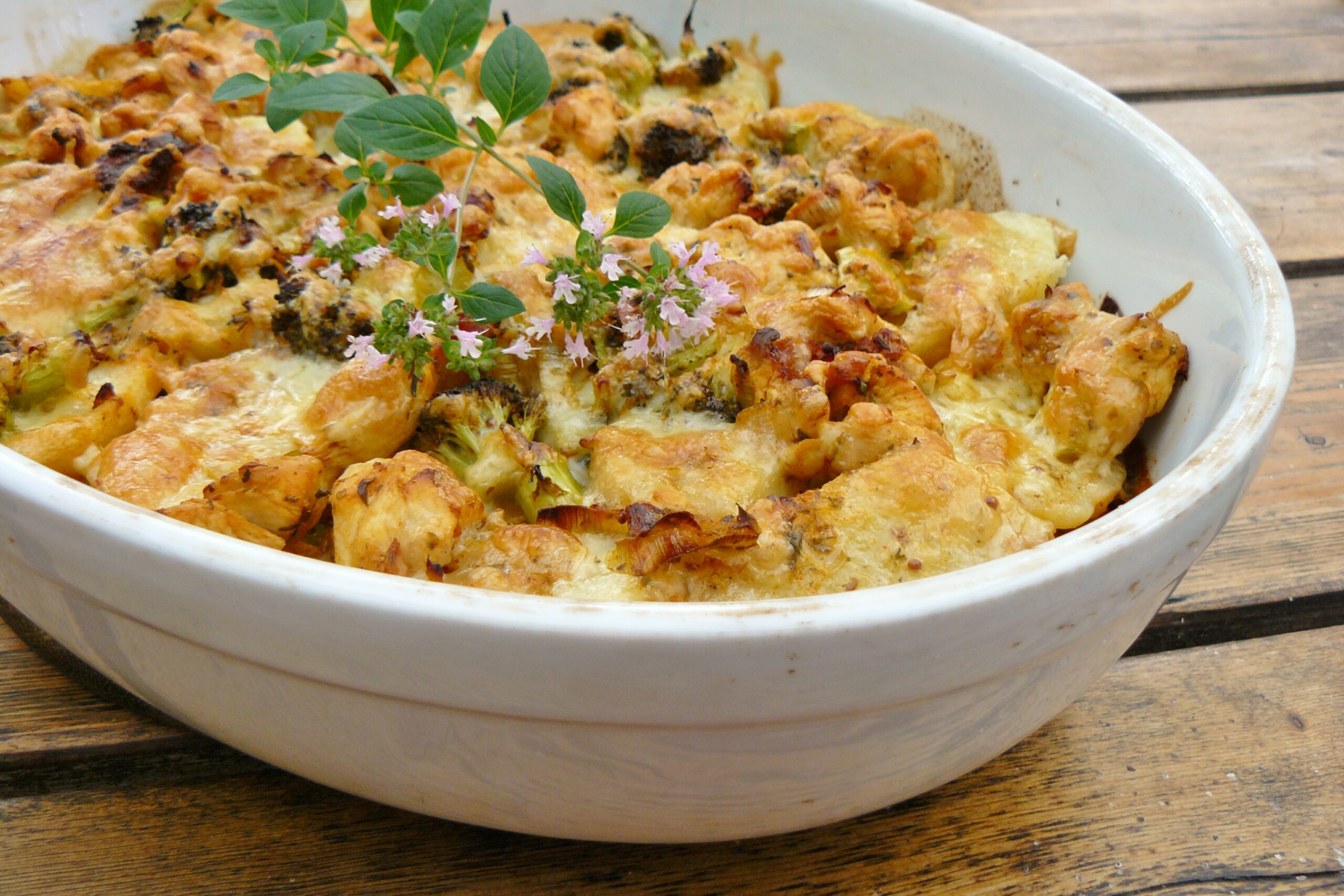 Heat the oil in a pan and fry the onion, garlic, chorizo and chicken until cooked, add the casserole mix, leeks, broccoli and water and fry for a further 5 min. Take off the ring and add the cream. Lay half the potato slices at the bottom of a casserole dish, then pour over half of the chicken mix, repeat and sprinkle with the grated cheese.